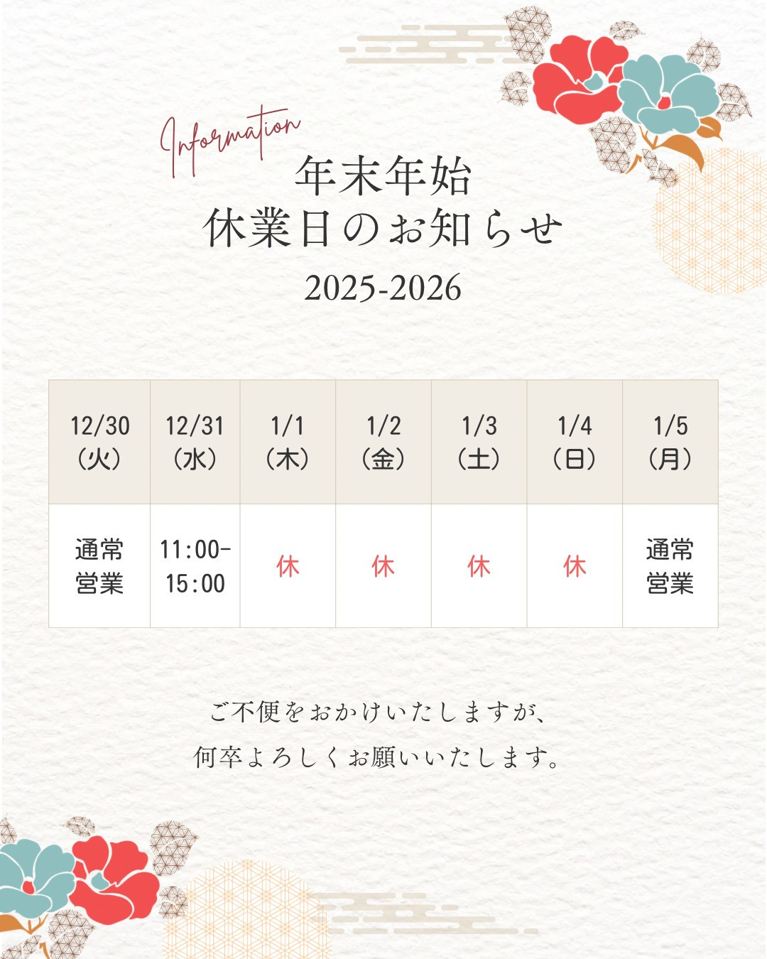 ※年末は31日(火)15時まで営業とさせていただき、